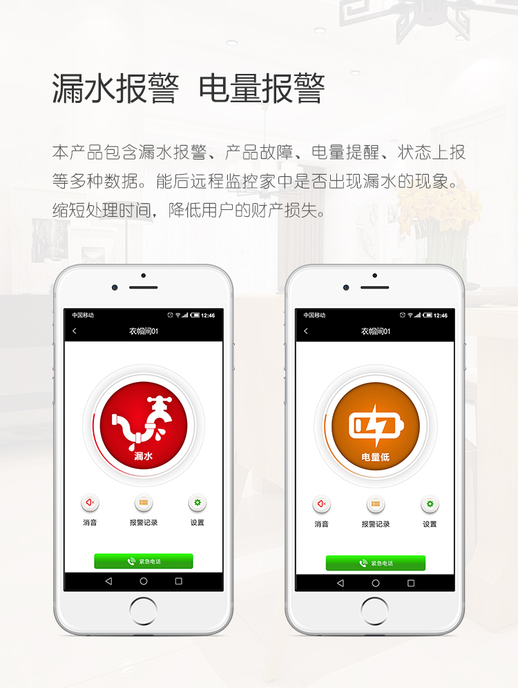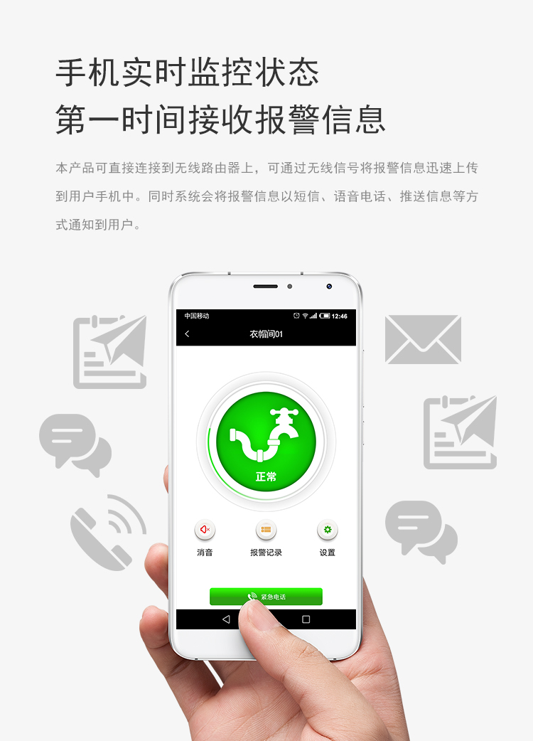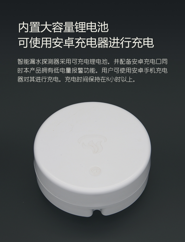 产品描述:本款WIFI型无线漏水探测报警器,防水等级达到IP67,可在5米深水下正常工作。采用家用无线网络传输方式,触控操作,可充电,可远程发送报警数据到手机APP,报警信息到手机,语音报警灯功能